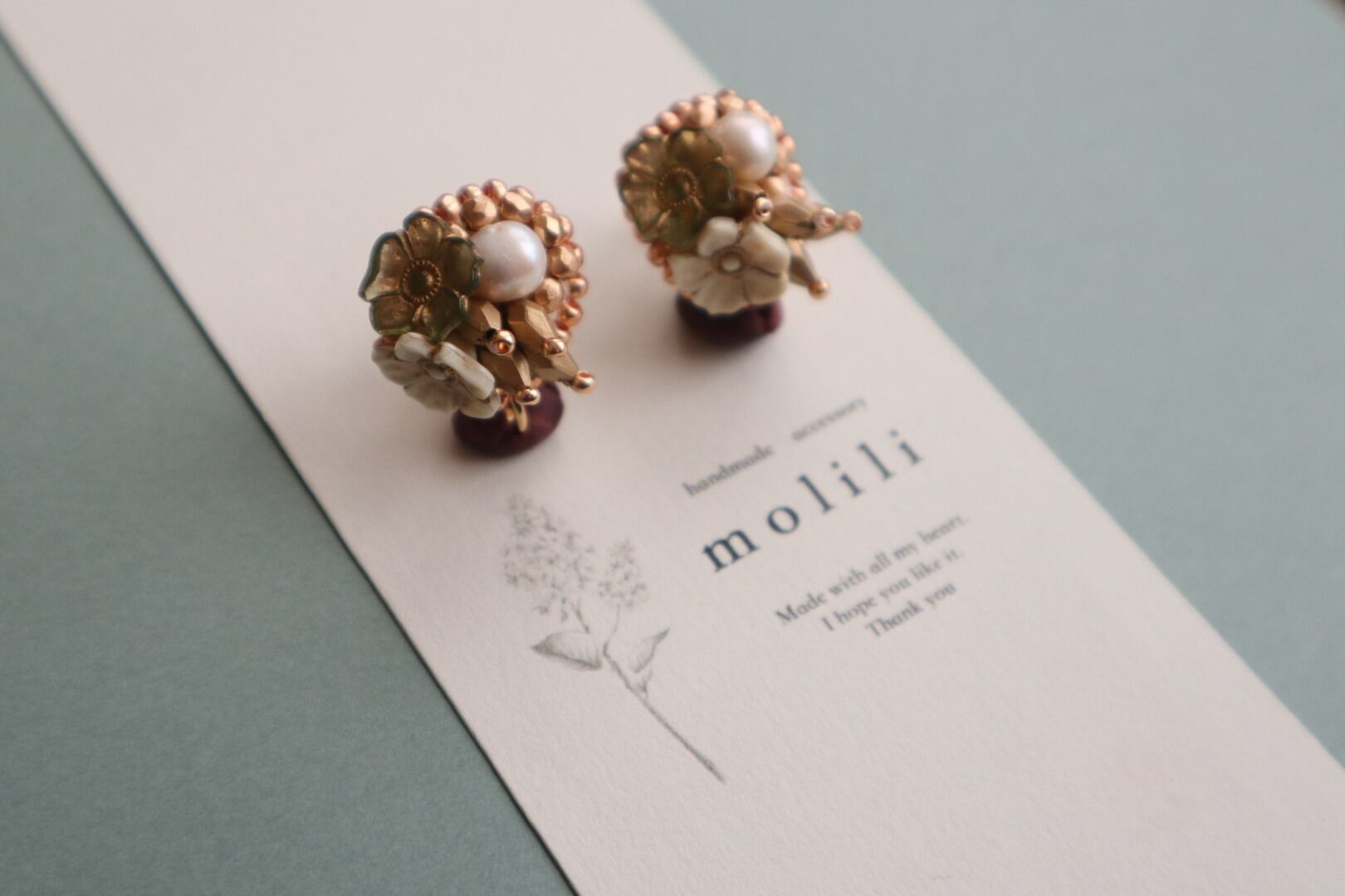 アンティーク調な白と緑のフラワーとチェコビーズ、そして一粒の淡水パールを縫い付けた、落ち着いたビジューアクセサリーです。